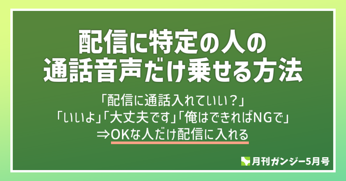 この記事では、上記のような場合に特定の人の通話音声だけを配信に乗せる方法を解説します。上記の例でいえば「AさんとBさんの声だけを配信に乗せて、Cさんの声は配信に乗せない。ただしもちろん、自分自身はCさんの声を聞くことができる」という状態を目指します。